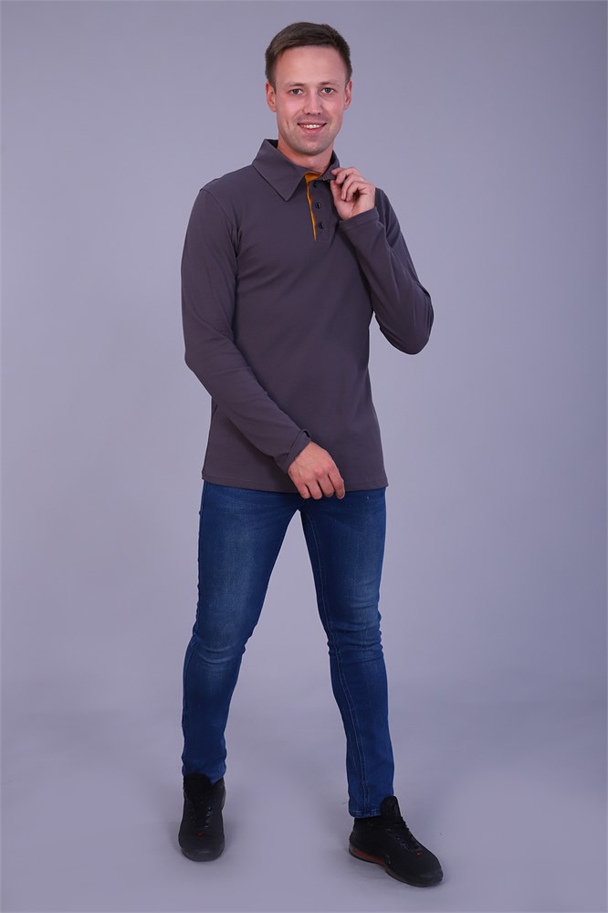 Футболка поло мужская с длинным рукавом из ткани лакост пике насыщенного серого цвета. На полочке планка с тремя пуговицами. Внутренняя планка и оборотная сторона воротника выполнены из ткани контрастного цвета. На полочке так же имеется печать. Футболка поло идеально подойдет для повседневной носки, отдыха, спорта и дома.