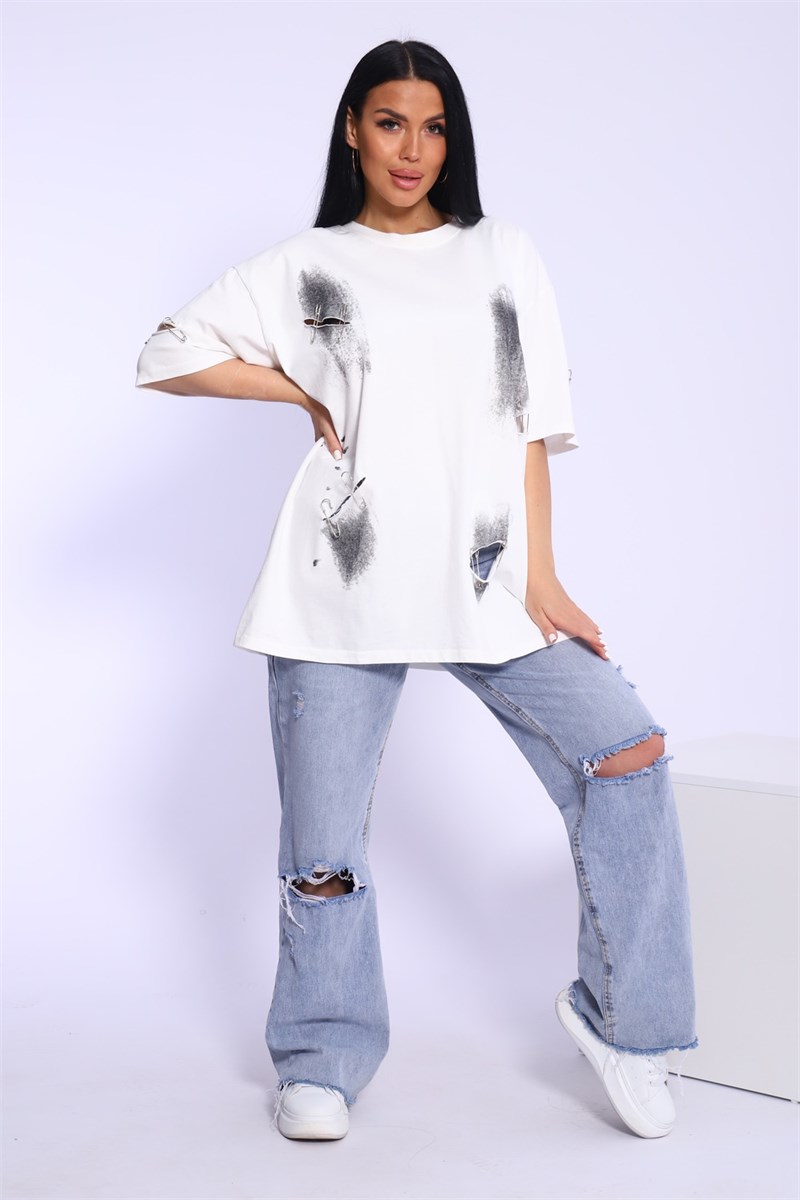 Футболка с булавками oversize - это стильная и комфортная одежда. Изготовлена из хлопка, очень плотная и не просвечивает. Футболка имеет большой размер, что делает ее комфортной и стильной. Она выделается необычным принтом и добавляет в ваш образ изюминку. Футболка удлиненная, что придает ей особый стиль. Идеально подходит на каждый день. Рукав спущенный и не сковывает движения. Длина рукава указана от плечевого шва. Производство Китай.
