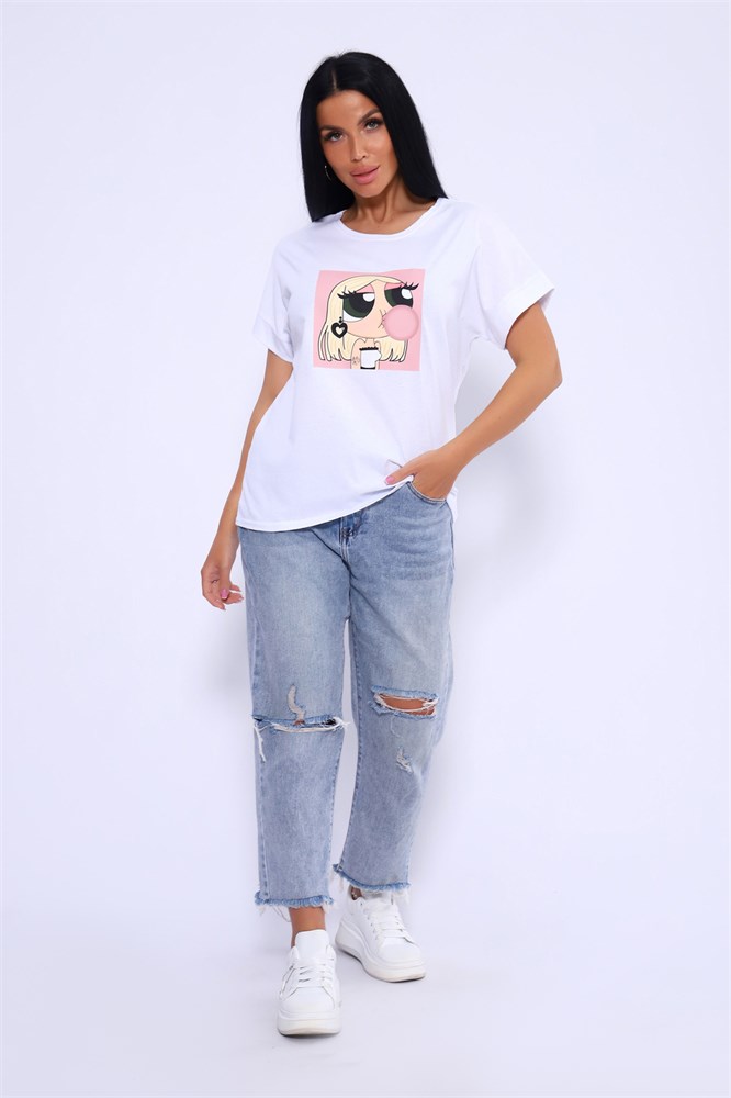 Футболка женская с ярким молодёжным принтом из мягкого, гипоаллергенного хлопкового трикотажа. Модель слегка приталенного силуэта, округлая горловина, спущенная пройма на манжете. Футболка - это универсальный элемент гардероба, который можно носить как на работу, так и на прогулку, в спортзал и просто дома. Комфортная, приятная к телу футболка подойдёт девушке любой фигуры и возраста.