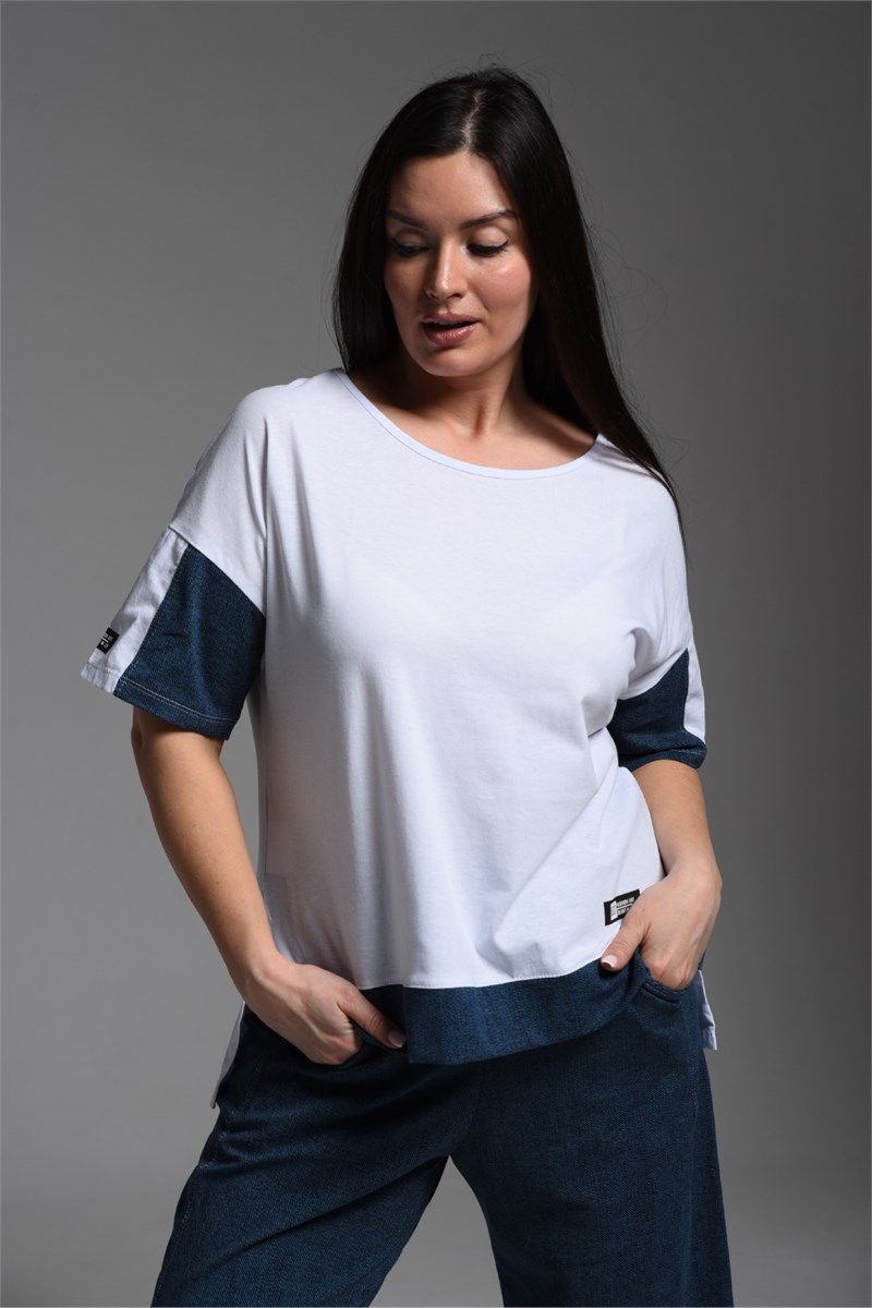 Футболка прямого силуэта, с округлой горловиной, с удлиненной спинкой, длиной до середины бедра. Низ полочки обработан вставкой из отделочного полотна. Спинка с кокеткой. Рукав короткий. В нижней части боковых швов обработаны разрезы. Горловина обработана бейкой из основного полотна.