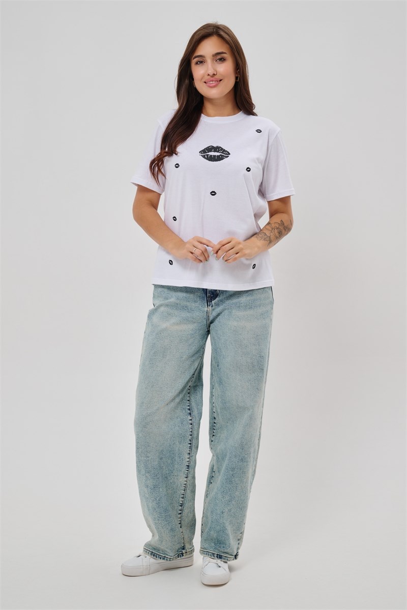 Женская футболка приталенного силуэта, выполненная из мягкой и приятной к телу кулирки. Модель отличается лаконичностью и удобством благодаря укороченным рукавам и аккуратному круглому вырезу горловины. Изюминкой изделия являются маленькие минималистичные принты в виде груб, выполненные в чёрном оттенке. Футболка универсальна, легко сочетается с различными элементами гардероба и станет отличным выбором для повседневной носки, подчёркивая женственную фигуру и индивидуальность своей обладательницы.