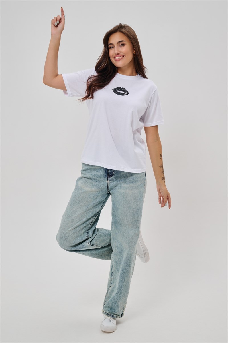 Женская футболка приталенного силуэта, выполненная из мягкой и приятной к телу кулирки. Модель отличается лаконичностью и удобством благодаря укороченным рукавам и аккуратному круглому вырезу горловины. Изюминкой изделия является минималистичный принт в виде груб, выполненные в чёрном оттенке. Футболка универсальна, легко сочетается с различными элементами гардероба и станет отличным выбором для повседневной носки, подчёркивая женственную фигуру и индивидуальность своей обладательницы.