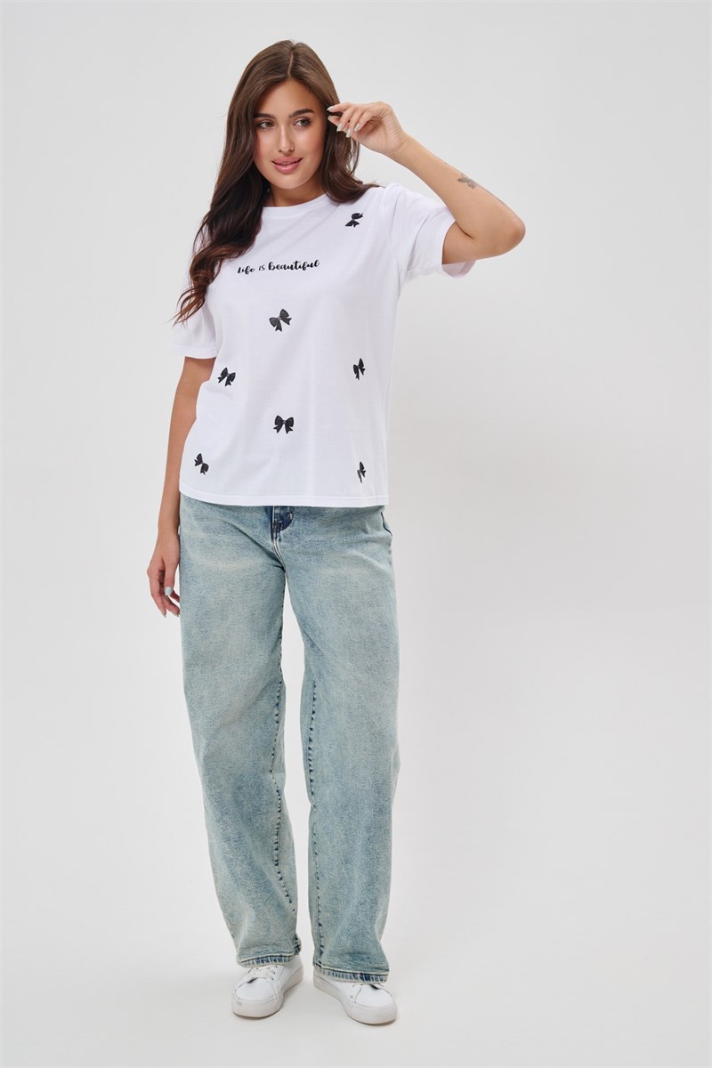 Женская футболка приталенного кроя, изготовлена из мягкого материала кулирки. Элегантная форма с короткими рукавами и аккуратным круглым вырезом создают ощущение лёгкости и свежести образа. Особенное внимание привлекает надпись на груди, украшенная минималистичными маленькими бантиками в сдержанном чёрном цвете. Такая деталь добавляет образу шарма и игривости, оставаясь одновременно простой и изысканной. Футболка легко впишется в гардероб современной девушки, добавив нотку кокетства любому образу.