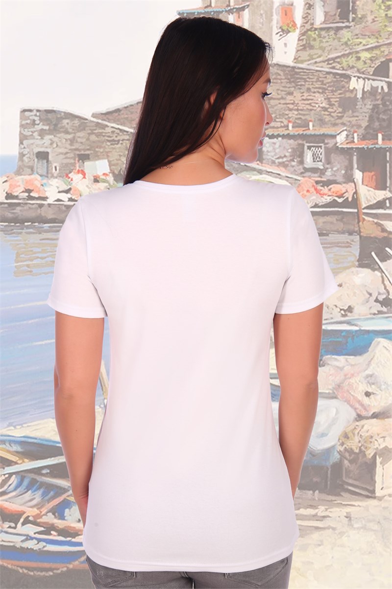 Футболка из мягкого хлопка. Горловина обработана двойным кантом. Низ изделия и рукава подогнуты.