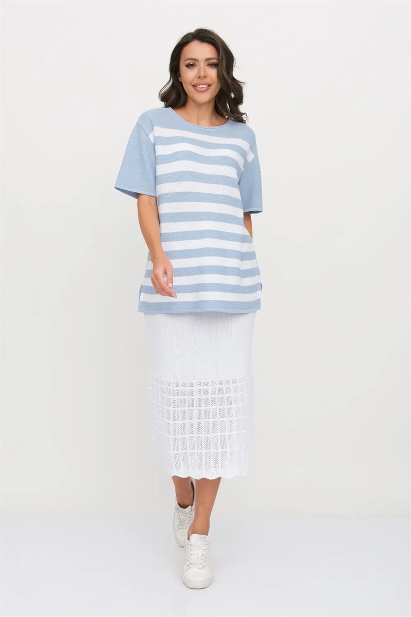 Классическая юбка полуприлегающего силуэта. Ширина переплетения-лапша увеличивается от пояса до колена, нижняя треть юбки выволнена ажурным переплетением. В пояс горизонтально проложена эластичная резинка. Юбку можно носить в комплекте с джемпером И 024, выполненным аналогичным переплетением и узором.