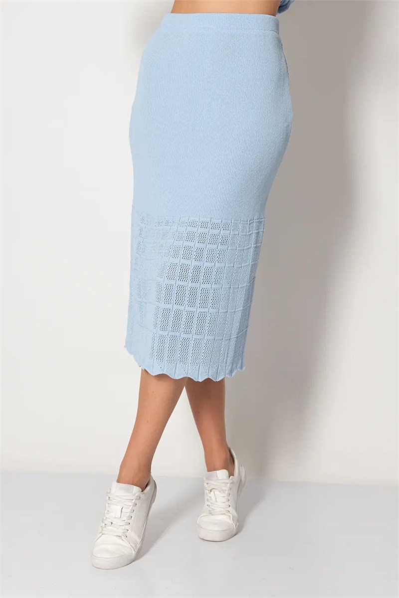 Классическая юбка полуприлегающего силуэта. Ширина переплетения-лапша увеличивается от пояса до колена, нижняя треть юбки выволнена ажурным переплетением. В пояс горизонтально проложена эластичная резинка. Юбку можно носить в комплекте с джемпером И 024, выполненным аналогичным переплетением и узором.