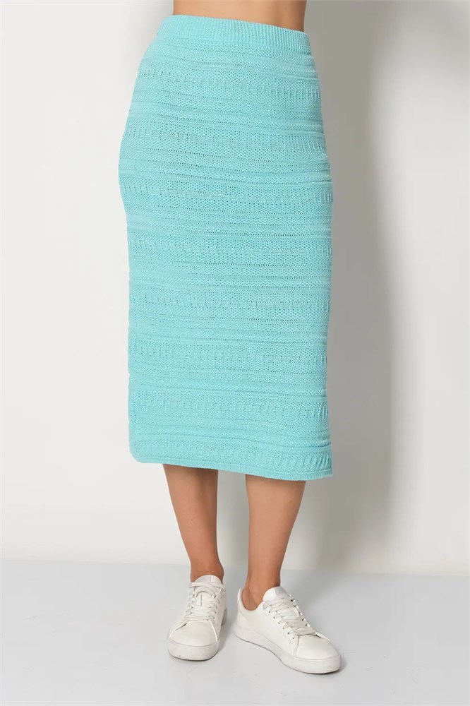 Классическая юбка прилегающего силуэта с боковым разрезом до колена. Юбка выполнена структурным рельефным переплетением. Можно носить как костюм с джемпером И 020.