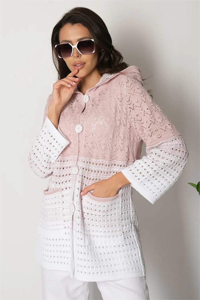 Ажурный удлиненный жакет полуприлегающего силуэта с капюшоном, застегивается на пуговицы. Рукава втачные длинной 7/8, немного расширены к низу. Два накладных кармана. Жакет выполнен ажурным переплетением с переходом цвета от светлого к темному.