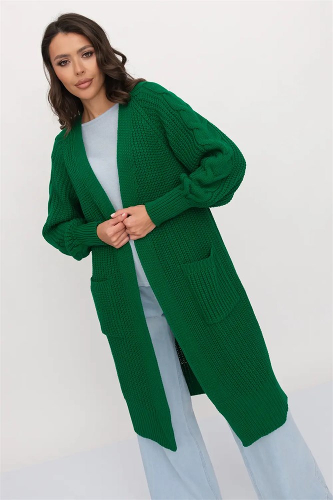 Кардиган женский вязаный свободного силуэта. V-образный вырез. Рукав-реглан длинный. По низу рукава и изделия эластичная резинка. Кардиган выполнен объемной вязкой "французская резинка". Карманы декорированы узором "косы".