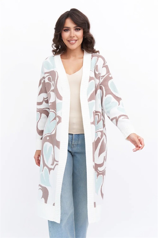 Кардиган женский вязаный свободного силуэта. V-образный вырез. Спущенное плечо, длинный рукав. По низу рукава и изделия эластичная резинка. Кардиган выполнен жаккардовым переплетением с абстрактным рисунком.Стильный кардиган станет незаменимой вещью в Вашем гардеробе, отлично сочетаясь с платьем, юбкой или брюками.
