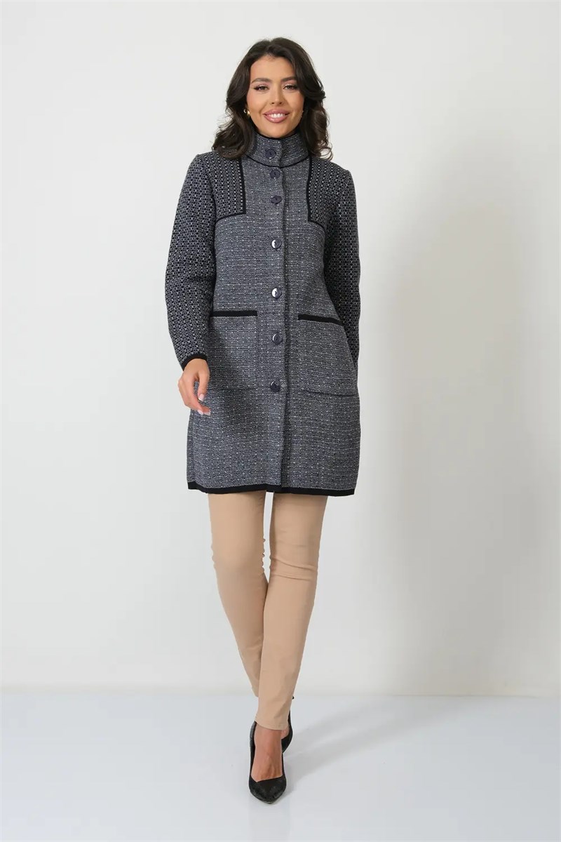 Женский вязаный кардиган полуприлегающего силуэта с воротником-стойкой. Кардиган застегивается на пуговицы. Рукава втачные длинные. Накладные карманы прямоугольной формы. Кардиган выполнен жаккардовым переплетением.