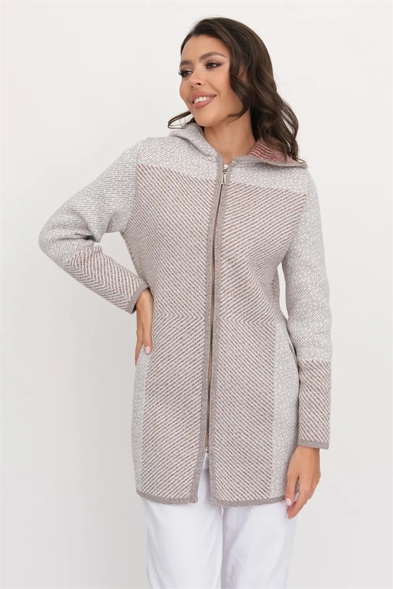 Женский вязаный кардиган полуприлегающего силуэта с капюшоном. Кардиган на молнии. Рукава втачные длинные. Накладные карманы на молнии. Кардиган выполнен жаккардовым переплетением.