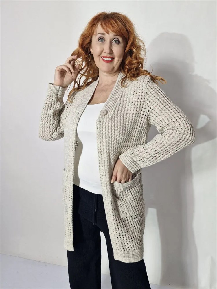 Женский вязаный кардиган с застежкой на пуговицу. V-вырез. Ажурный узор придает кардигану оригинальную легкость.