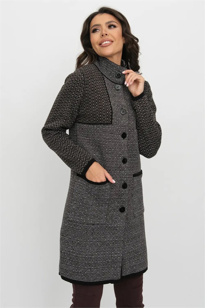 Женский вязаный кардиган полуприлегающего силуэта с воротником-стойкой. Кардиган застегивается на пуговицы. Рукава втачные длинные. Накладные карманы прямоугольной формы. Кардиган выполнен жаккардовым переплетением.