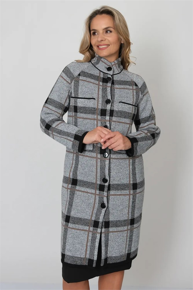 Женский вязаный кардиган полуприлегающего силуэта с воротником-стойка на пуговицах. Рукав-реглан полной длины. Оригинально выполненные накладные нагрудные карманы с клапаном внизу, имитирующим второй нижний карман. Кардиган выполнен жаккардовым переплетением, образующим актуальный рисунок "клетка". Стильно и комфортно.