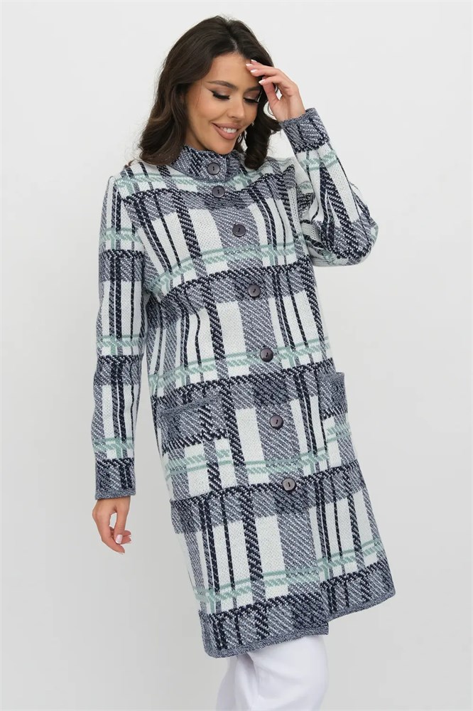 Женский эффектный вязанный кардиган прямого силуэта. Воротник-стойка. Застегивается на пуговицы Рукава втачные длинные. Два накладных кармана. Кардиган выполнен жаккардовым переплетением образующим геометрический рисунок "клетка". Он согреет вас в прохладный день и подарит ощущение невероятного комфорта.