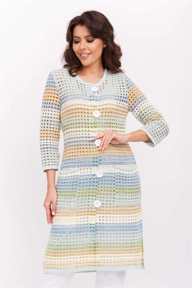 Свободный прямой силуэт и крупная сеточка придают кардигану оригинальную легкость. А цветовая гамма показывает в изделии романтический стиль. Представлена она светлыми, мягкими тонами и полутонами с нежными переходами от одного цвета в другой. Благодаря такому многоцветию палитра красок подобна радуге после дождя.