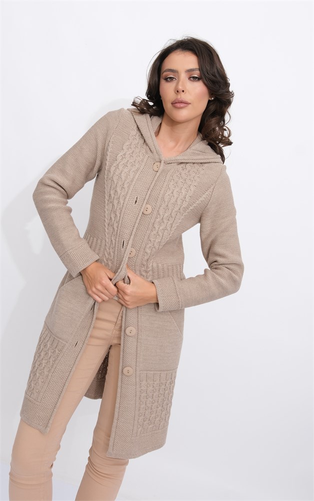 Женский вязаный кардиган с капюшоном на пуговицах. Трикотажное пальто выполнено из высококачественной пряжи с составом 30% шерсть 70% ПАН. Длинная кофта на пуговицах имеет круглый вырез горловины с комфортным капюшоном, длинные втачные рукава и функциональные накладные карманы - кенгуру. Длина изделия 85 см, длина рукава 61 см. Теплая кофта полуприлегающего силуэта застегивается на пуговицы по всей длине изделия. Полушерстяной кардиган выполнен рельефным переплетением в сочетании с "косами", по низу рукава и изделия выполнена эластичная резинка. Демисезонное пальто средней длины имеет свободный крой и подойдет для любого типа фигуры. Однотонный кардиган составит уютный, модный и лаконичный образ в качестве верхней одежды теплой весной или осенью и прохладным летом. Вязаное пальто можно носить поверх любого комплекта повседневной одежды. Модный, теплый, спортивный кардиган станет прекрасным подарком к любому празднику.