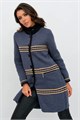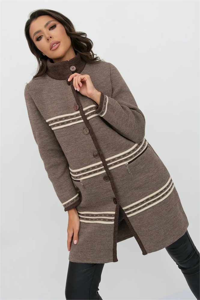 Женский вязанный кардиган прямого силуэта. Воротник-стойка. Застегивается на пуговицы Рукава втачные длинные. Два прорезных кармана с молнией. Кардиган выполнен жаккардовым переплетением с горизонтальными контрастными полосами. Он согреет вас в прохладный день и подарит ощущение невероятного комфорта.