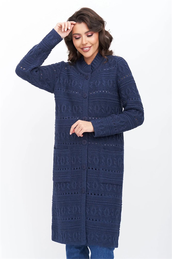 Стильный вязаный женский кардиган прямого силуэта на пуговицах. Воротник - стойка. Рукав втачной полной длины. Накладные карманы. Оригинальный узор с ажуром. Кардиган с добавлением шерсти согреет в прохладную погоду и придаст оригинальности любому повседневному образу.