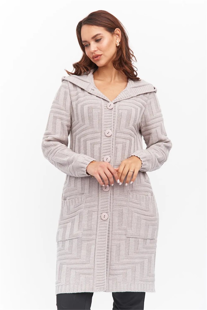 Кардиган полуприлегающего силуэта с капюшоном. Рукава втачные длинные. Два накладных кармана квадратной формы. Застегивается на пуговицы. Изделие выполнено комбинированным сочетанием вязки, образующей геометрический рисунок, Планка полочки и край капюшона выполнены платочной вязкой.