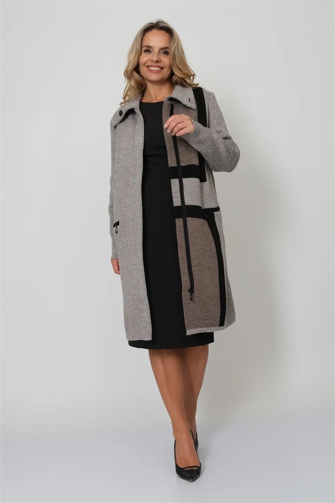 Женский вязаный кардиган полуприлегающего силуэта с асимметричным отворачивающимся воротником-стойкой. Рукава втачные длинные. Два прорезных кармана на молнии. Кардиган застегивается на молнию. Изделие выполнено жаккардовым переплетением с геометрическими контрастными вставками