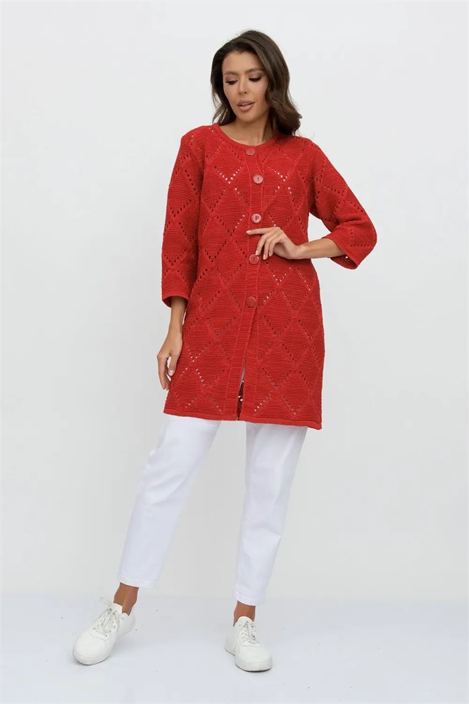 Кардиган женский вязаный, выполнен ажурной вязкой. Состав изделия включает в себя 50% хлопка. Кардиган прямого покроя, застёгивается на пуговицы. Горловина изделия круглая, откетлевана узкой бейкой петля в петлю. Рукава втачные, свободного облегания 7/8.