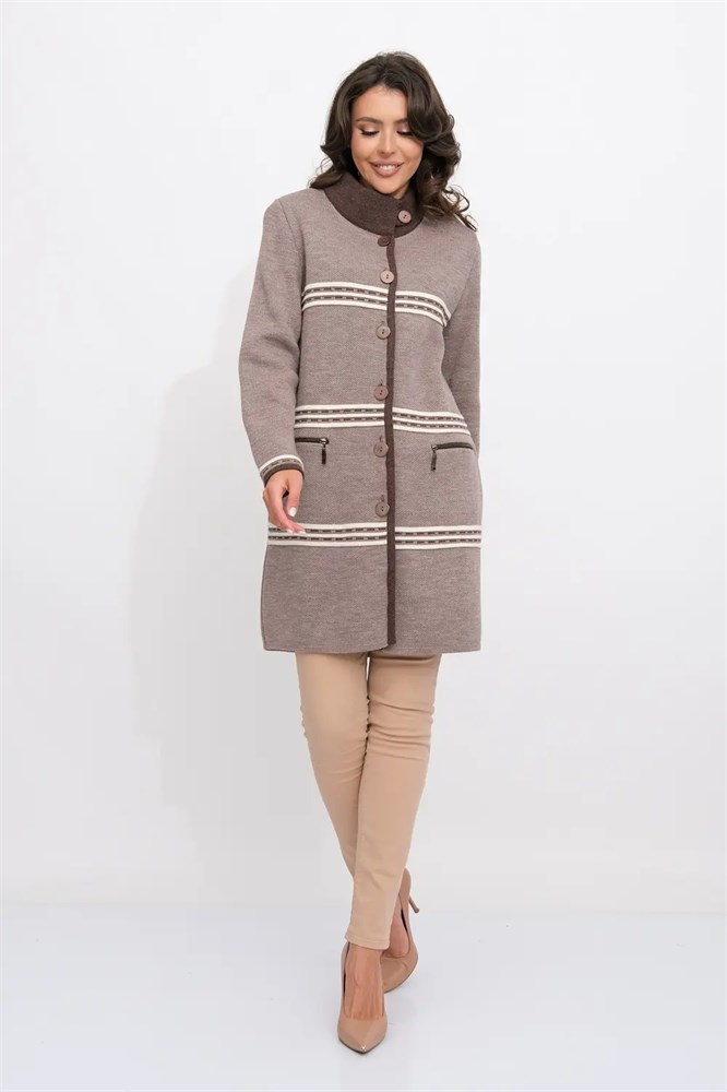 Женский вязанный кардиган прямого силуэта. Воротник-стойка. Застегивается на пуговицы Рукава втачные длинные. Два прорезных кармана с молнией. Кардиган выполнен жаккардовым переплетением с горизонтальными контрастными полосами. Он согреет вас в прохладный день и подарит ощущение невероятного комфорта.