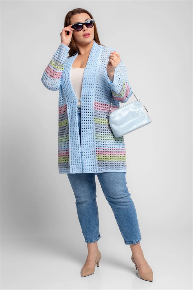 Кардиган свободного силуэта с длинным втачным рукавом. По переду проходят отворачивающиеся борта. Небольшая застежка по переду. Кардиган выполнен переплетением "сетка" с цветными переходами.