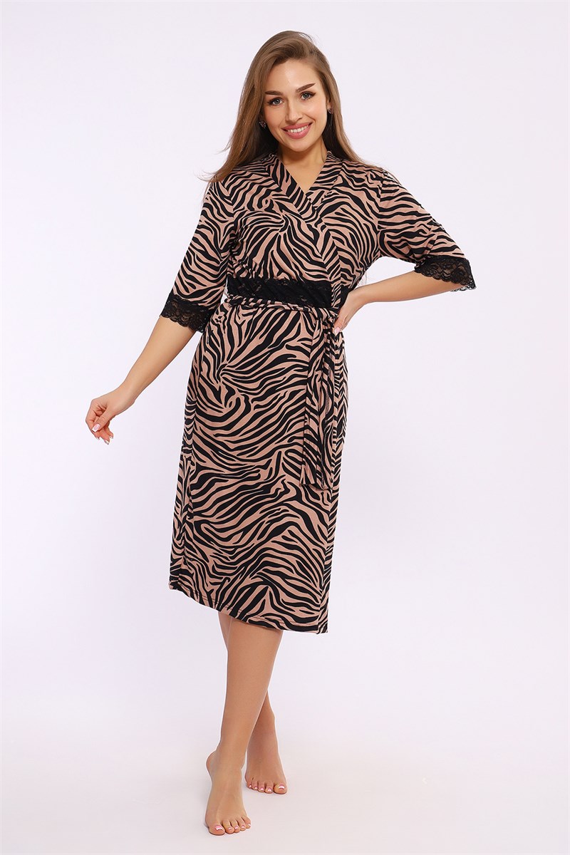 Халат запашной с поясом. Рукава короткие, украшены эластичным кружевом. На полочке и спинке декоративная вставка из кружева.