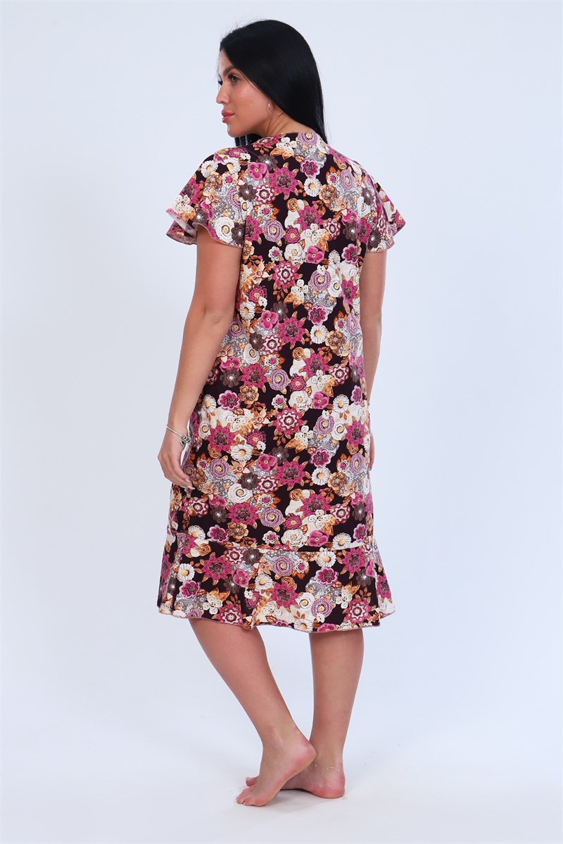 Халат женский домашний из кулирки с принтом длиной ниже колен. Халат полуприталенного силуэта с рельефами. Халат с центральной застежкой на тесьму - молнию. Перед с круглым вырезом и круглым воротником из отделочного однотонного материала с рельефами из линии проймы. С двумя симметричными карманами. Вход в карман прямой из ткани отделки. Рукава втачные короткие.