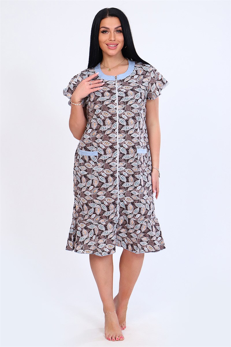 Халат женский домашний из кулирки с принтом длиной ниже колен. Халат полуприталенного силуэта с рельефами. Халат с центральной застежкой на тесьму молнию. Перед с круглым вырезом и круглым воротником из отделочного однотонного материала с рельефами из линии проймы. С двумя симметричными карманами. Вход в карман прямой из ткани отделки. Рукава втачные короткие.