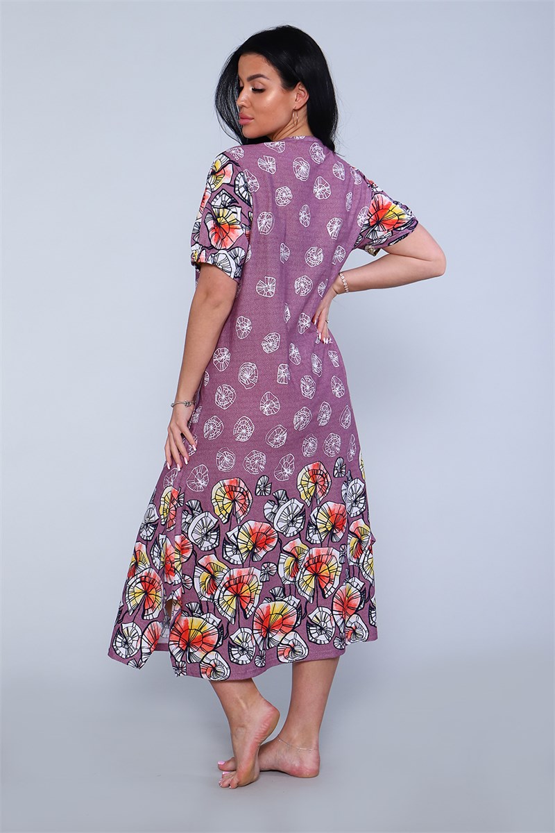 Халат женский, свободного кроя. На полочке халата в боковых швах расположены карманы. На рукавах посередине низка в подгибке втачена резинка, которая придает небольшую пышность рукаву. Изделие А-образного силуэта с хорошим расширением к низу, отлично садится на женщин с широкими бедрами. Халатик хорошо подходит для дома и отдыха на даче.