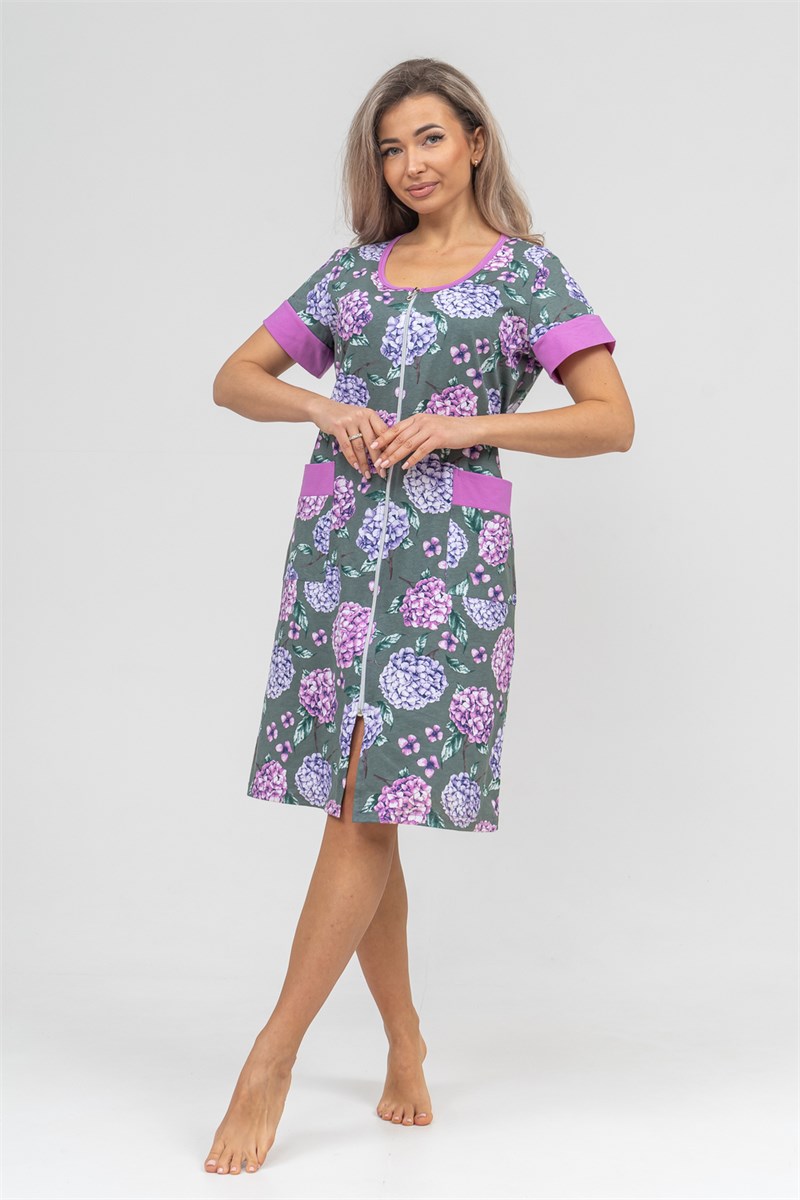 Женский халатик на молнии самая распространенная и универсальная одежда для домашнего отдыха и хозяйственных хлопот. После трудного рабочего дня, приходя домой, первым делом хочется переодеться. И данная модель это идеальный вариант среди представительниц прекрасной половины человечества. Модель выполнена из 100% хлопчатобумажной ткани. Халат так же дополняет яркая отделка по рукавам и карманам. А пояс на линии талии поможет легко смоделировать женственный силуэт и при этом Вы будете чувствовать себя легко и непринуждённо. Данная модель прекрасно подойдёт для дома, дачи и отдыха, создавая по-настоящему яркий образ и хорошее настроение! Рост модели на фото 165см.