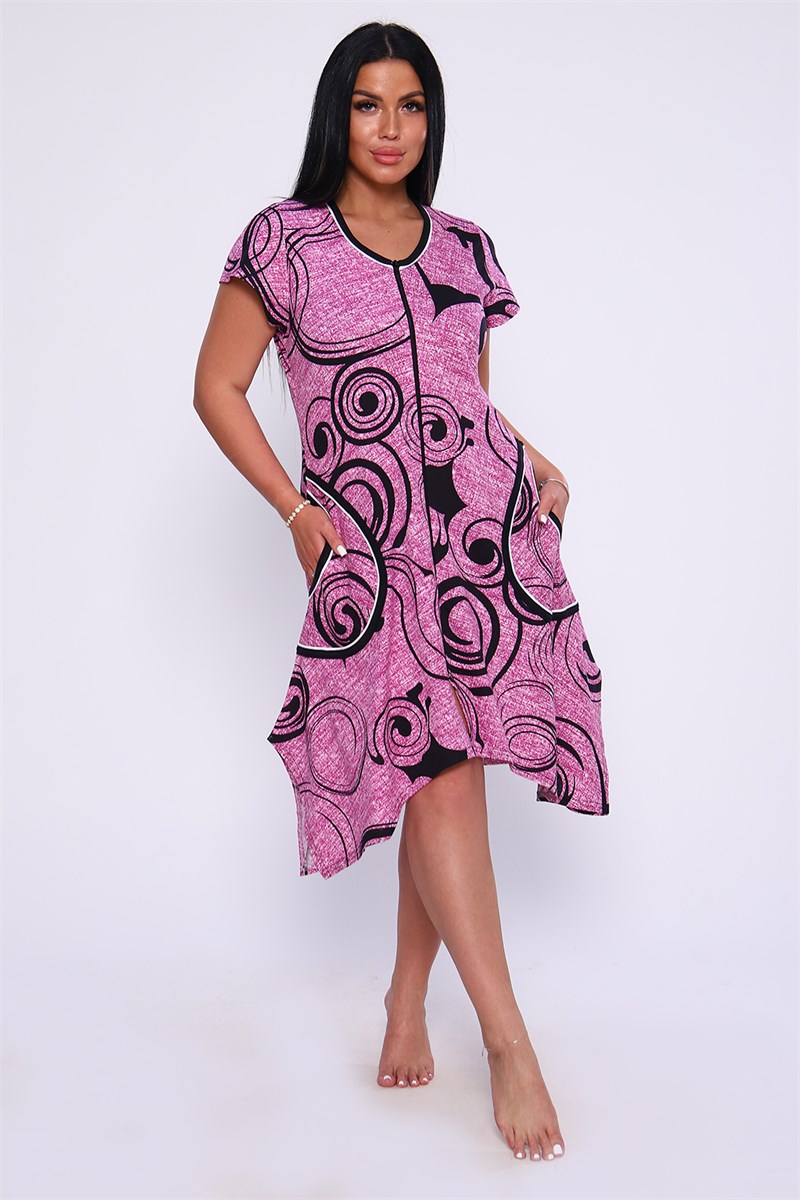 Женский халат на молнии выполнен из кулирки с коротким рукавом, длиной ниже колена, с накладными карманами, очень приятный к телу.