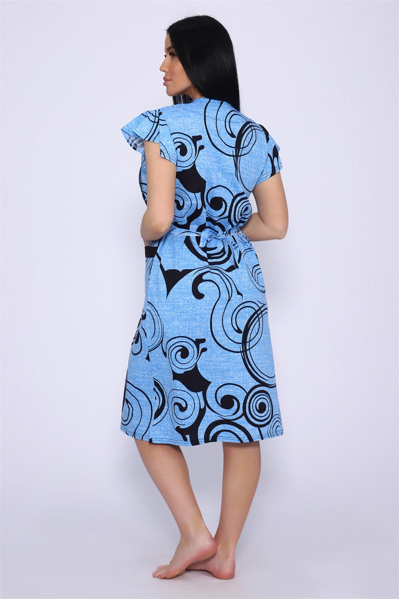 Оригинальный женский халат с красивым принтом на ткани. Рукав короткий в форме крылышка, с накладными карманами, отложной треугольный воротник. Застежка-молния, длина ниже колена, очень приятный к телу.