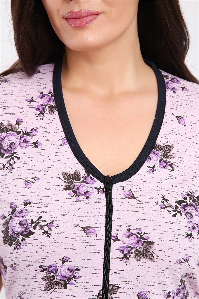 Женский халат выполнен из мягкого и комфортного материала розового цвета с нежным цветочным принтом, создающим женственный и романтичный образ. Основной цвет халата розовый с изящным рисунком роз в винтажном стиле. По краю карманов и застежки проходит контрастная черная окантовка, которая добавляет стильный акцент. Халат средней длины, чуть ниже колена, подходит для комфортного домашнего использования. Удобные накладные карманы с декоративной отделкой. Застежка на молнию по всей длине, что делает халат практичным и легким в использовании. Рукава средней длины, обеспечивающие комфортное прилегание. Этот халат идеальное сочетание функциональности и эстетики, подходящее для повседневной носки дома.