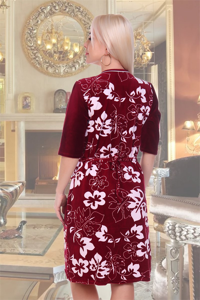 Элегантный женский халат из велюра. Дизайн в виде белых цветочных силуэтов, белая окантовка, застегивается на молнию, рукава чуть ниже локтей, по бокам накладные карманы, общая длина приблизительно до коленей.