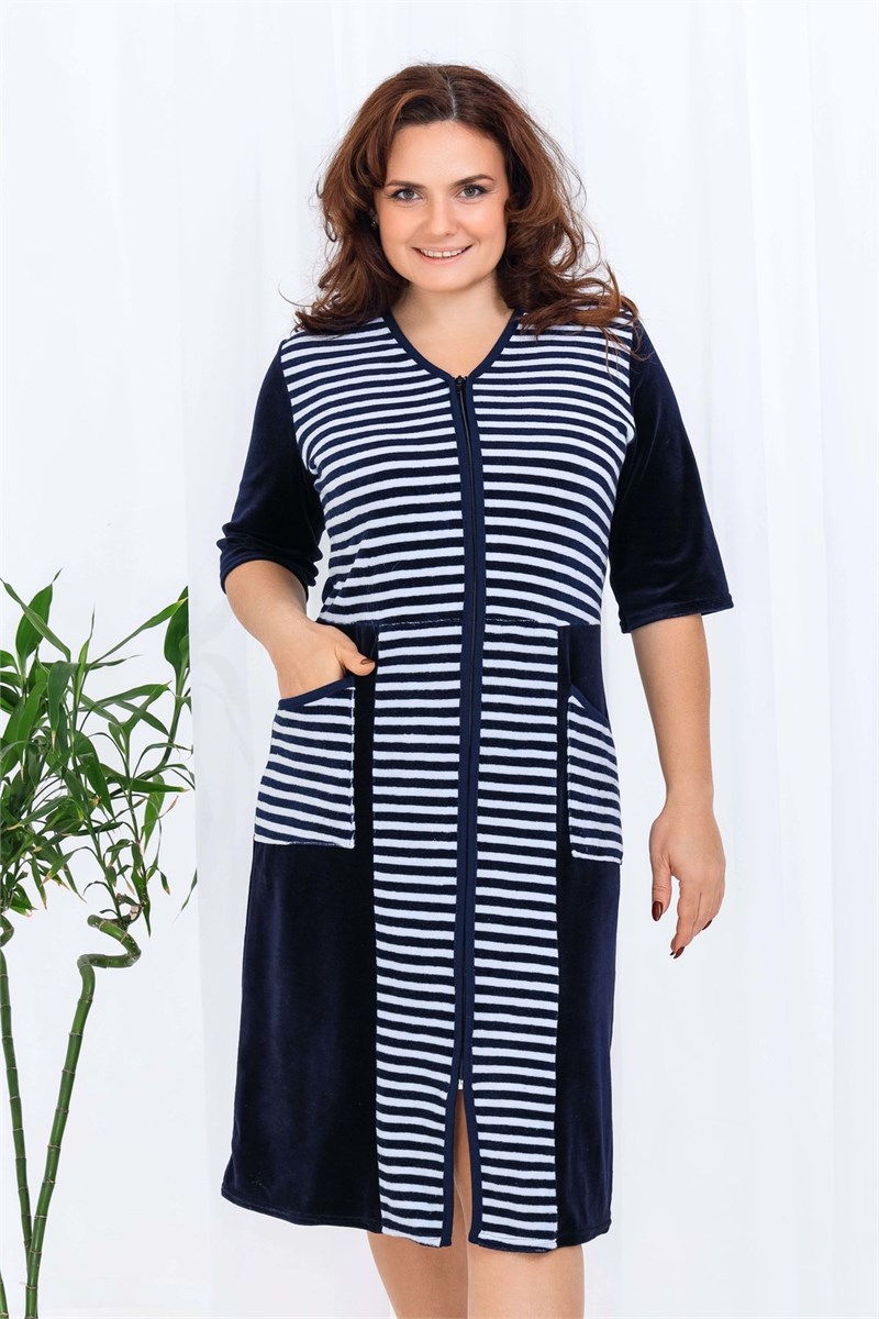 Халат женский из велюра, на молнии. Полочка отрезная по линии талии, в боковых швах два полупояса, рукав короткий. Размерный ряд имеет большие размеры. Ткань велюр - 80% хлопок, 20% полиэстер