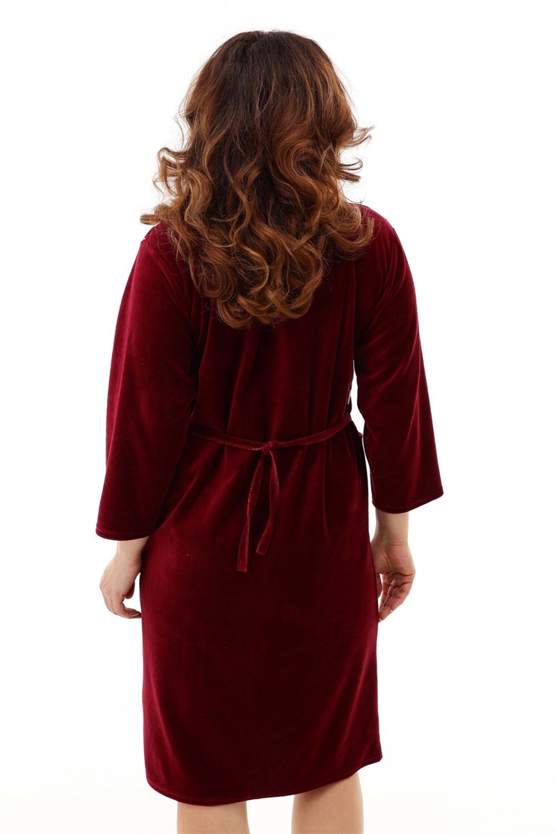 Халат женский на молнии, воротник откладной, рукав длинный, имеет накладные карманы, в боковых швах два полупояса. Длина изделия до середины колена. Ткань велюр.