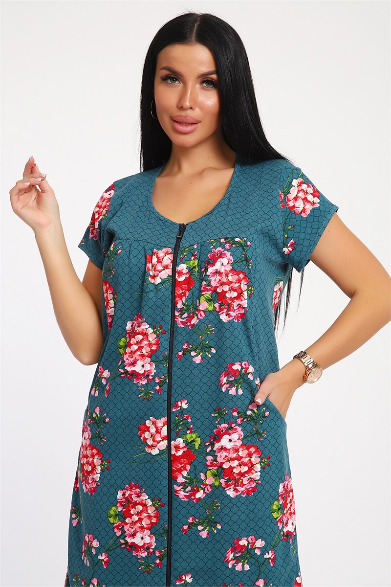 Халат женский на молнии из комбинированного хлопкового трикотажа с яркими соцветиями на контрастном фоне. Модель слегка приталенного силуэта с рельефами, на груди кокетка, втачной короткий рукав, в рельефах удобные карманы. Легкий, приятный к телу халатик сочетает в себе комфорт и элегантность, добавит вашему образу яркости и индивидуальности. Модель представлена в широком размере ряде до 62 размера. Халат прекрасно подходит на любой тип фигуры, подчеркнет вашу женственность и создаст атмосферу уюта дома и на даче.