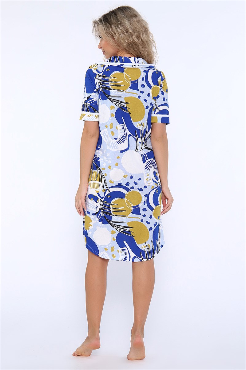 Халат на молнии с короткими рукавами на манжетах. Карманы в боковых швах. Низ изделия полукруглый. Горловина с декоративным воротником. Комфортен для повседневной носки.