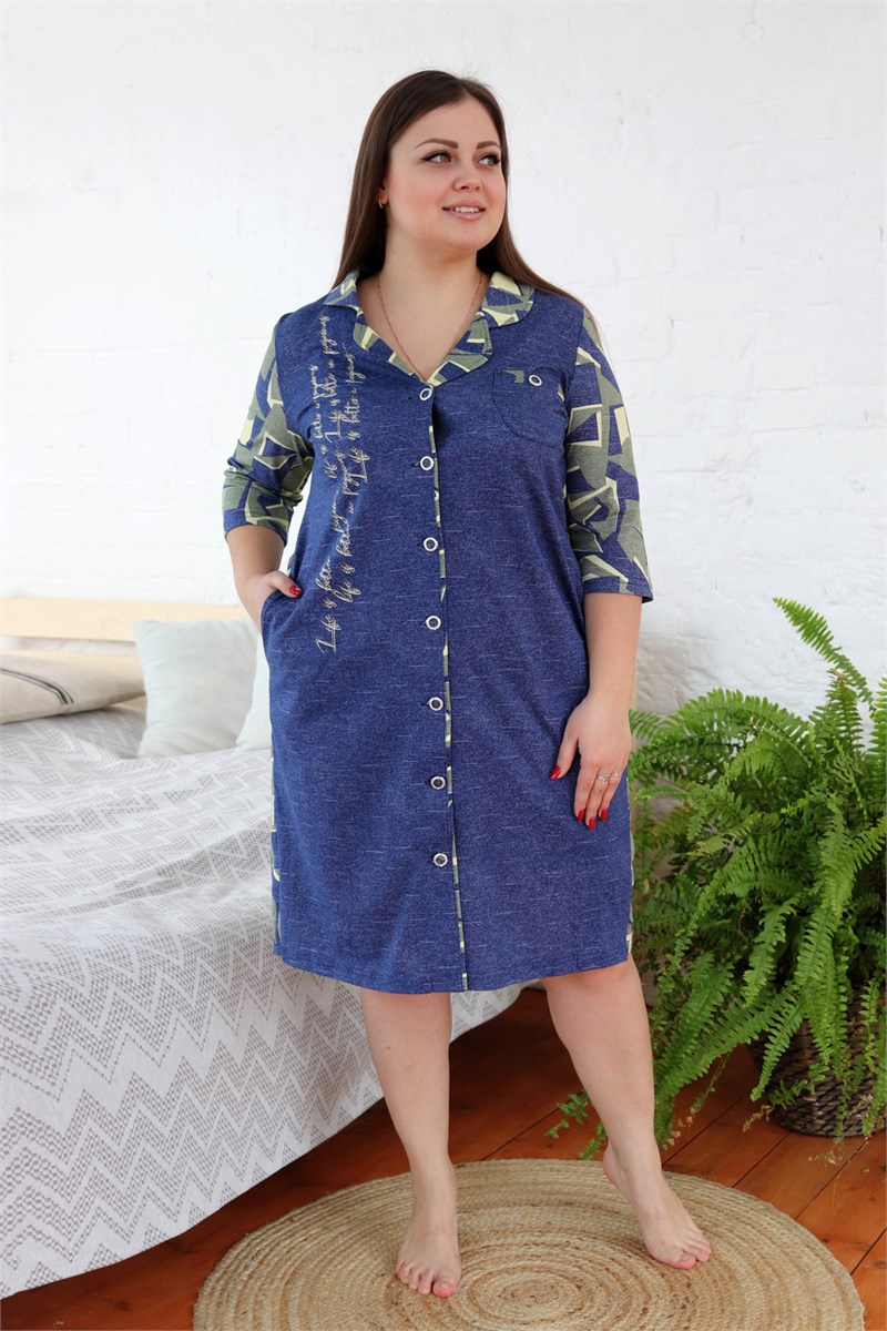 Халат женский полуприлегающего силуэта. Воротник английского типа, рукав втачной 3/4. Застежка на петли - пуговицы. Воротник, спинка, рукава и обтачка нагрудного кармана из отделочной ткани. На полочках два внутренних кармана, на левой полочке нагрудный карман, на правой полочке принт.