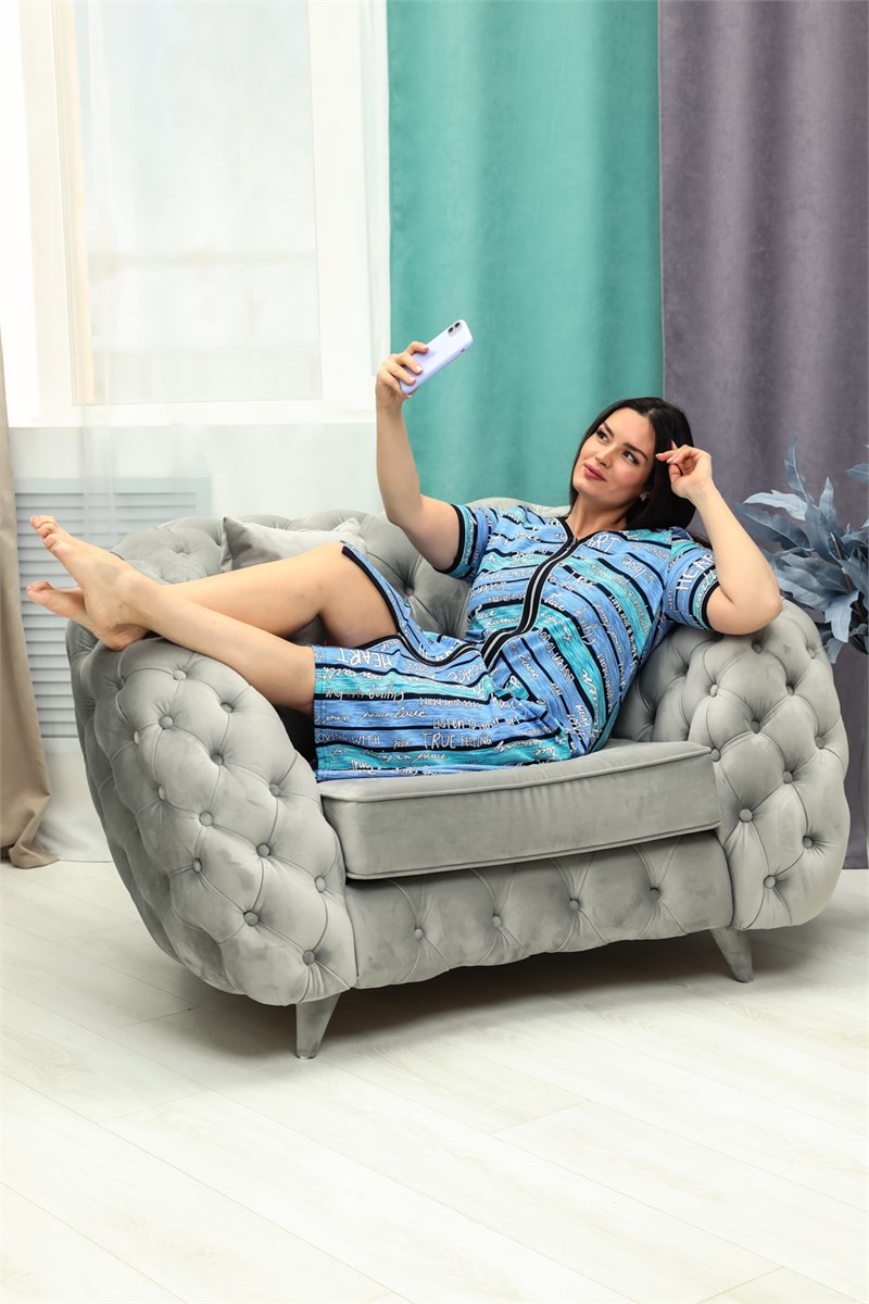 Халат женский полуприлегающего силуэта. Горловина округлая, рукав втачной короткий. Застежка на тесьму-молнию. Халат состоит из верхней и нижней частей с разнонаправленной полосой. На полочке имеются внутренние карманы.