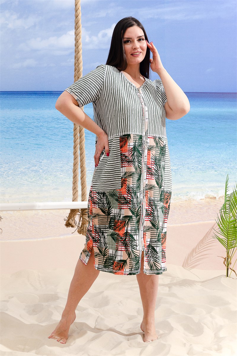 Халат женский полуприлегающего силуэта. Горловина округлая, рукав втачной короткий. Застежка на тесьму-молнию. Верхние части полочки и спинки, а также рукава и накладные фигурные карманы из ткани в полоску. Нижние части полочки и спинки из ткани-компаньона. Край борта, горловина, низ рукавов обработан бейкой с декоративной отделочной строчкой.
