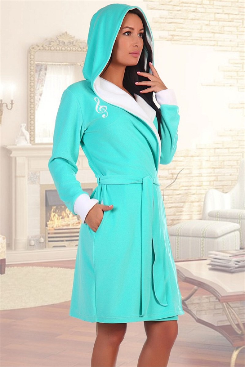 Махровый запашной халат с поясом. Принт в виде скрипичного ключа, длина чуть выше коленей, рукава длинные, имеется капюшон. Два варианта расцветки коралловая и ментоловая. Размеры от 44 до 58. Есть возможность розничного приобретения товара.