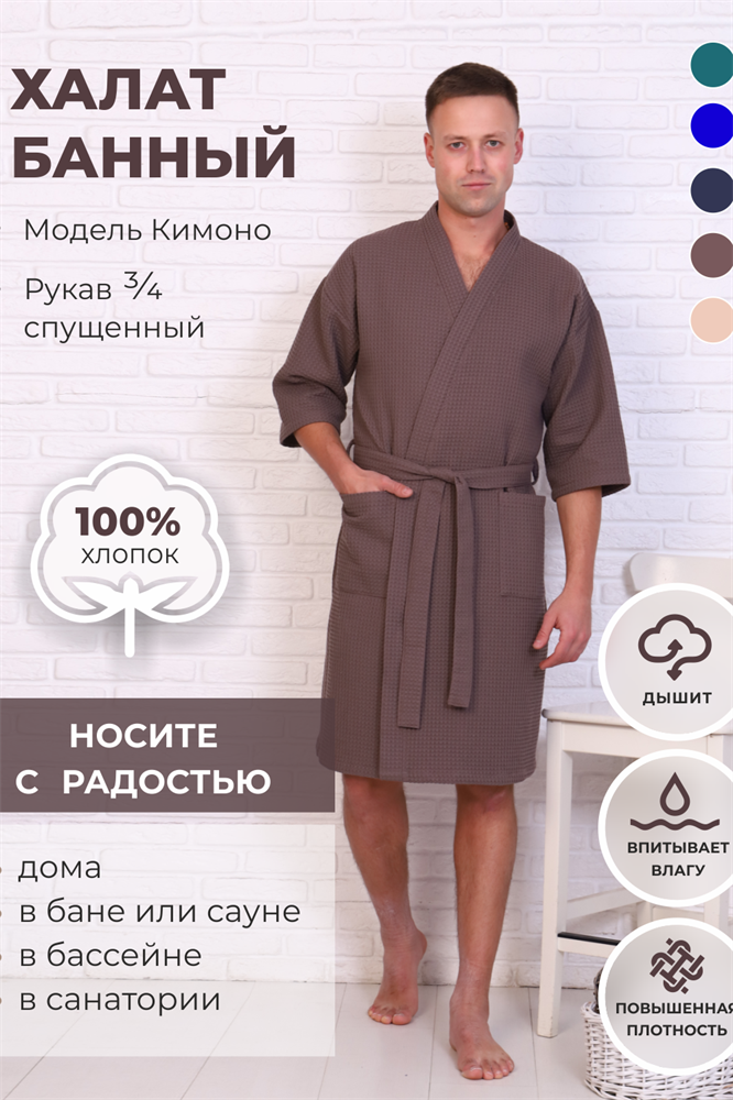 Вафельный халат-кимоно. Рукав 3/4. Карманы накладные. Воротник планка. Размерный ряд от 44/46 до 64/66. Плотность вафельного полотна 242 гр.