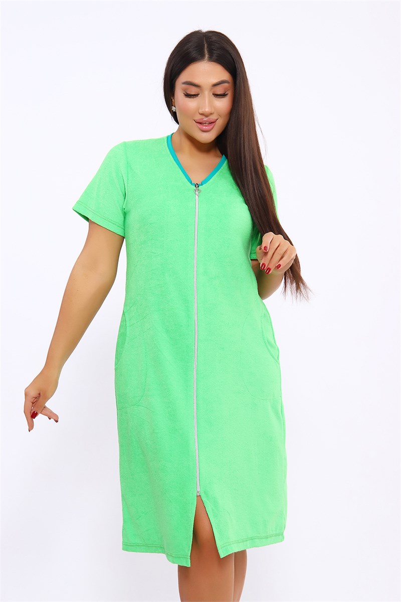 Халат женский на молнии красивой яркой расцветки с коротким рукавом выполнен из мягкой махры. Горловина обработана обтачкой, по бокам карманы. Халат свободного кроя, идеально подойдет для дома и отдыха.