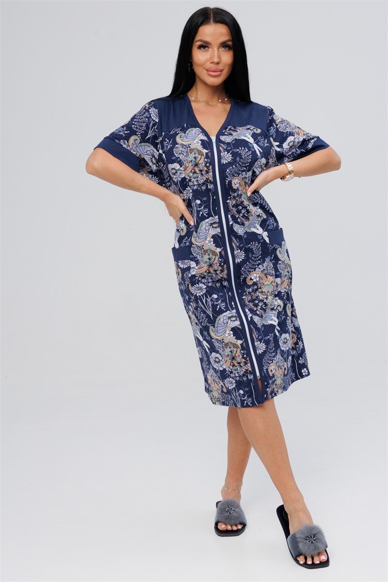 Халат женский выполнен из трикотажного полотна кулирка. Халат полуприлигающего силуэта, вточной короткий рукав. Застежка-молния.Кокетки переда, манжет, отделка кармана окантовка горловины и борта выполнена из отделочной ткани. Пояс в боковых швах.