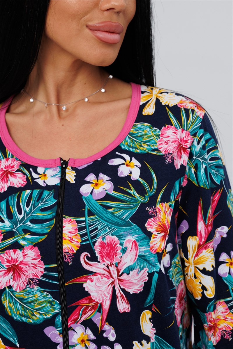 Халат женский выполнен из трикотажного набивного полотна кулирка полу прилегающего силуэта, круглый вырез горловины, втачной рукав, накладные карманы застежка на молнию. По низу рукава и низу изделия воланы.